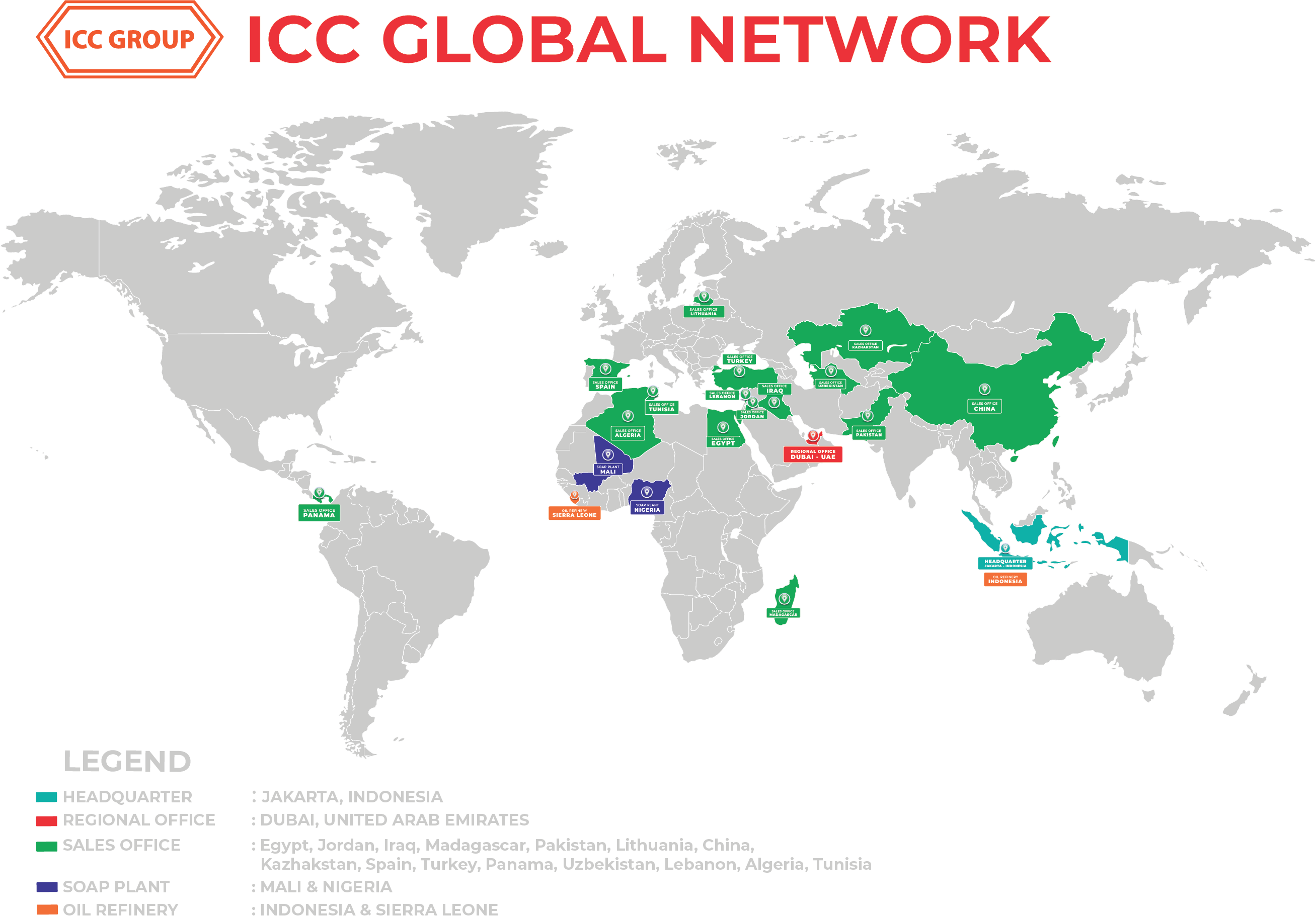 ICC has established itself as one of the largest exporters of Palm Oil and Palm Kernel Oil products, with a vast network that spans across 84 countries covering nearly 75% of the globe. Starting with our initial operations in Africa, which remains a key market, we have successfully expanded our reach to the Middle East, Asia, Europe, and beyond.